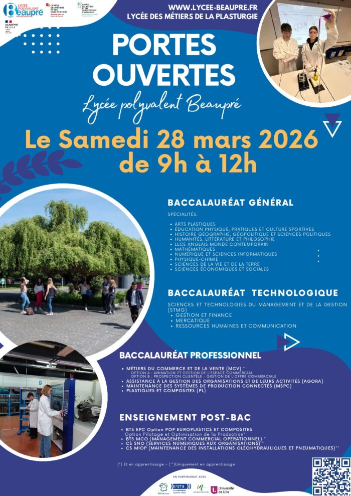 Venez nombreux découvrir nos formations initiales et scolaires lors des Portes Ouvertes post-bac au lycée Beaupré d’Haubourdin, organisées le samedi 28 mars de 9 h à 12h.