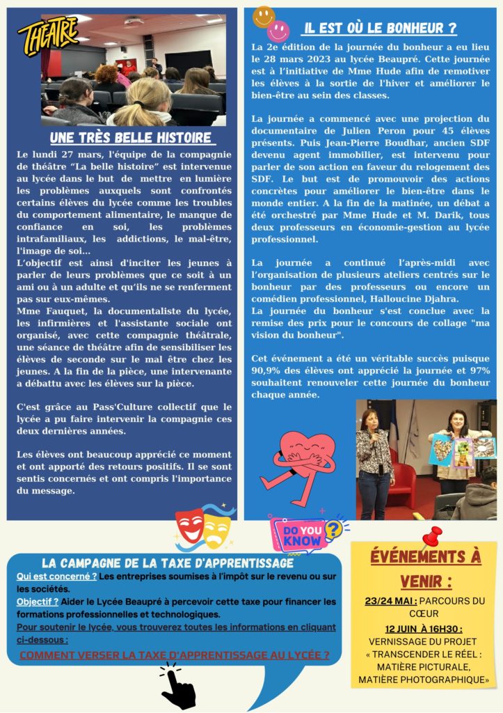 La NEWSLETTER ACTU’BEAUPRÉ est élaborée par les étudiants BTS MCO2 (management commercial opérationnel), avec leur professeure Madame DEVIGNE.